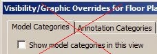 If you go back to the Visibility/Graphics dialog box, we can get it to do one last trick. We could turn off all the model elements to leave the annotation visible. However, you can't just use the neat looking "Show model categories" checkbox at the top left - because the software designers have left us with a chaotic jumble of categories under each tab.Select all the worksets listed (they are only model worksets, as you cannot select view worksets here)