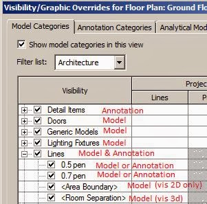 - Even worse, Lines include sub-categories for Area Boundaries and Room Separation lines, which should really be subsets of Areas and Rooms; and these line subcategories don't even behave the same way although they perform similar functions - Area lines are never visible in 3D, while Room separation lines are visible in 3D.