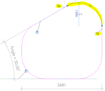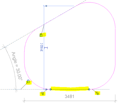 - In v2017, tangency locks can be applied to each end of all the arcs. In this example, all of the straight lines are aligned and locked (to references or have locked dimensions). So what changes when the angle is modified is the radii of one of the arcs (top left).