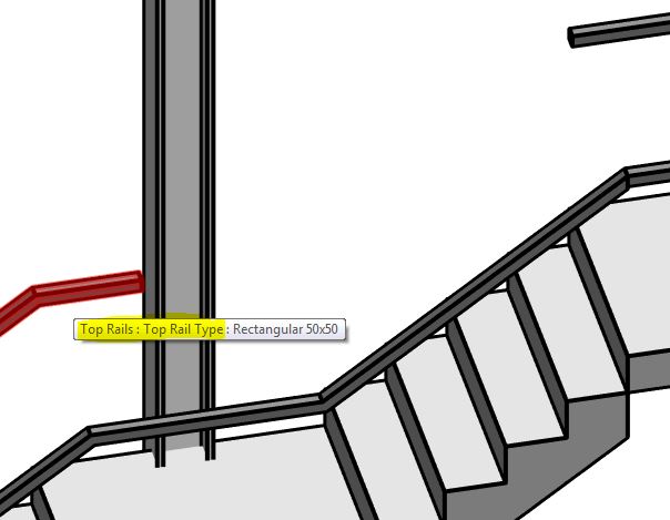 Once the top part of the railing is removed, Tab-select the 'Top Rail' (or Handrail) - it is important to select one of these sub-elements, not the overall railing. NB. if your railing does not have either of these sub-elements, this technique won't work (eg. old style top rails)